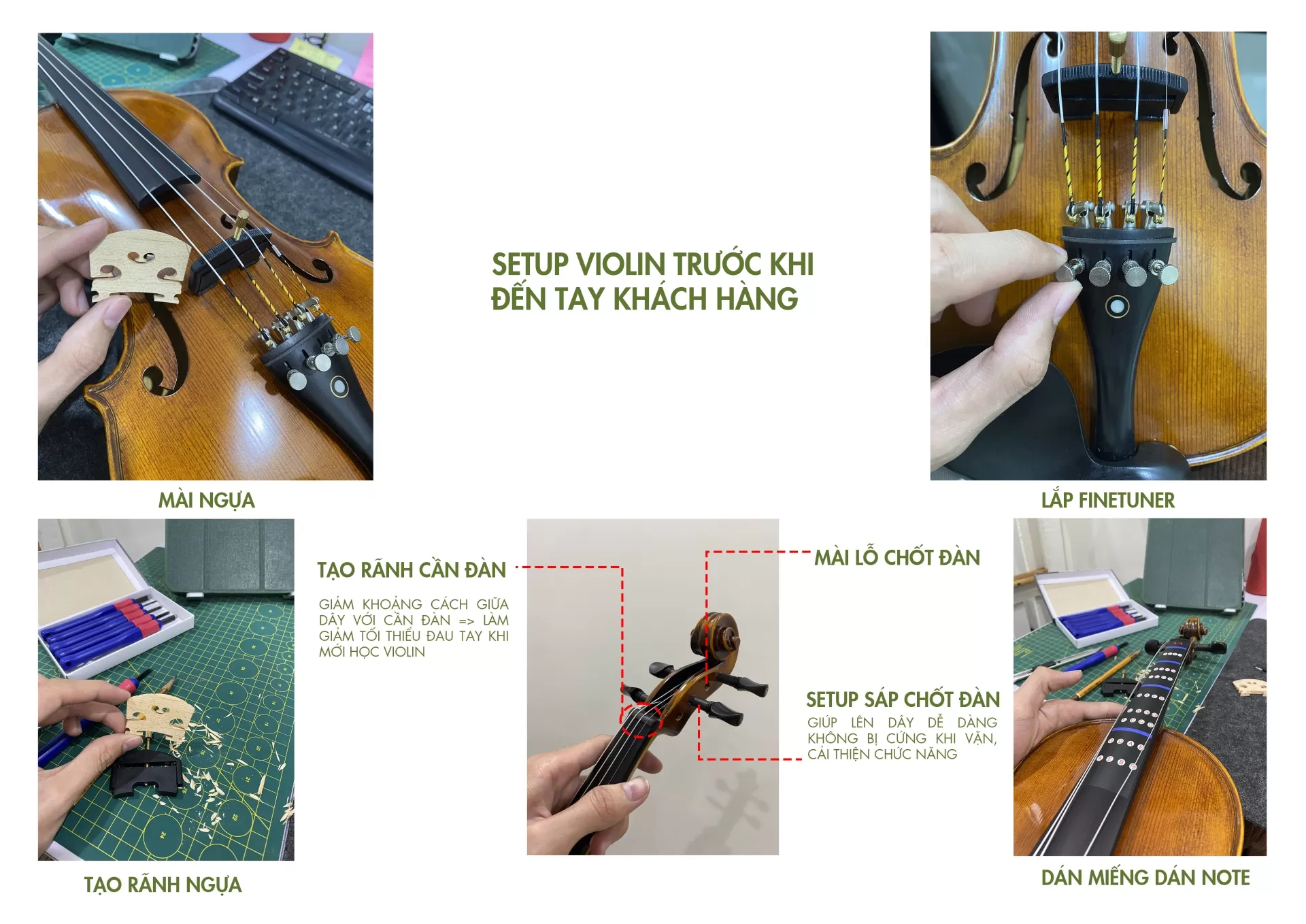 | Setup | Setup thủ công trước khi vận chuyển tới tay khách hàng, dán note, mài ngựa,... | Phụ kiện | Gỗ Mun |